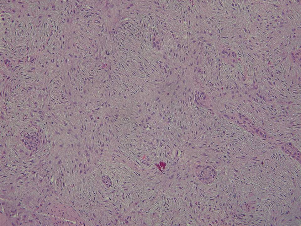 - Solid areas are soft to firm, gray or white, granular or fibrous