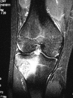 Fig. 1-3: AP and Lateral plain x-rays of a benign fibrous histiocytoma shows an eccentric lytic lesion in the proximal tibia, well- demarcated with a prominent sclerotic rim. No soft tissue mass or trabeculations are seen.