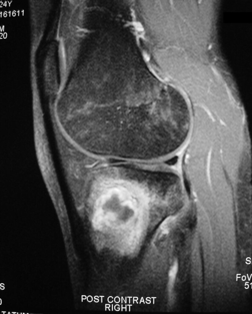 • Heterogeneous high signal intensity with low signal in surrounding sclerotic bone on T2-weighted images