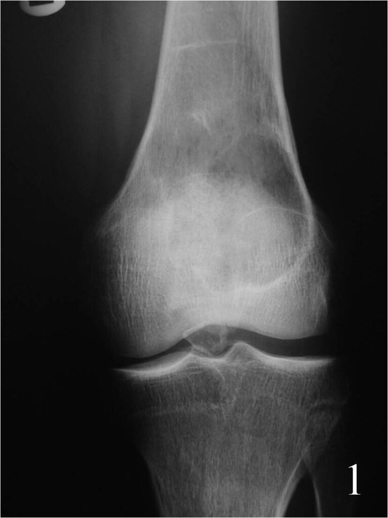 Fig. 1 AP Xray of the knee showing an eccentric well circumscribed geographic and expansile lesion on the distal meta-ephyphiseal area of the femur