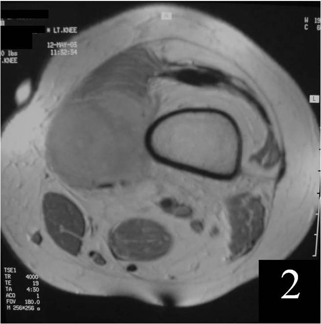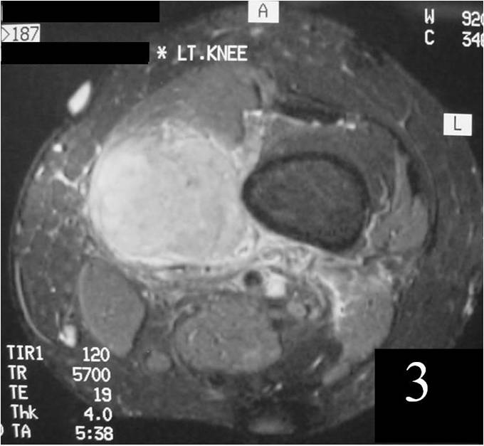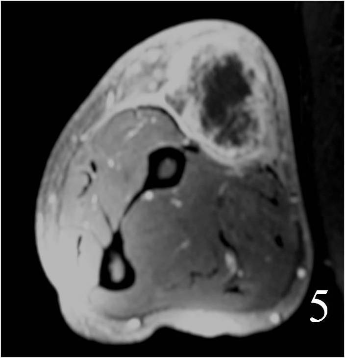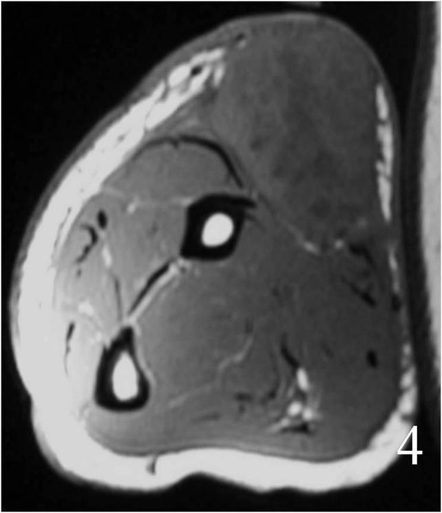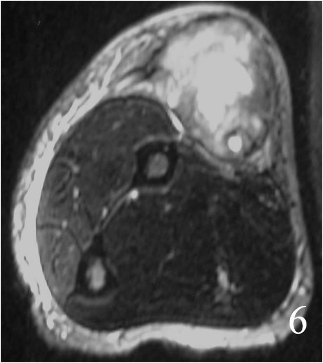 Fig. 4 MRI of a leiomyosarcoma of the forearm shows a mass isointense to muscle on T1W image, heterogeneous on T2W (Fig. 5) and enhances with contrast T1W fat suppressed (Fig. 6)