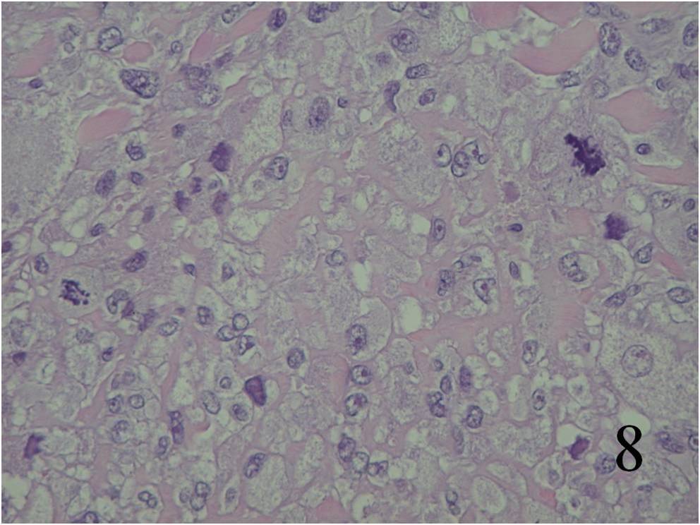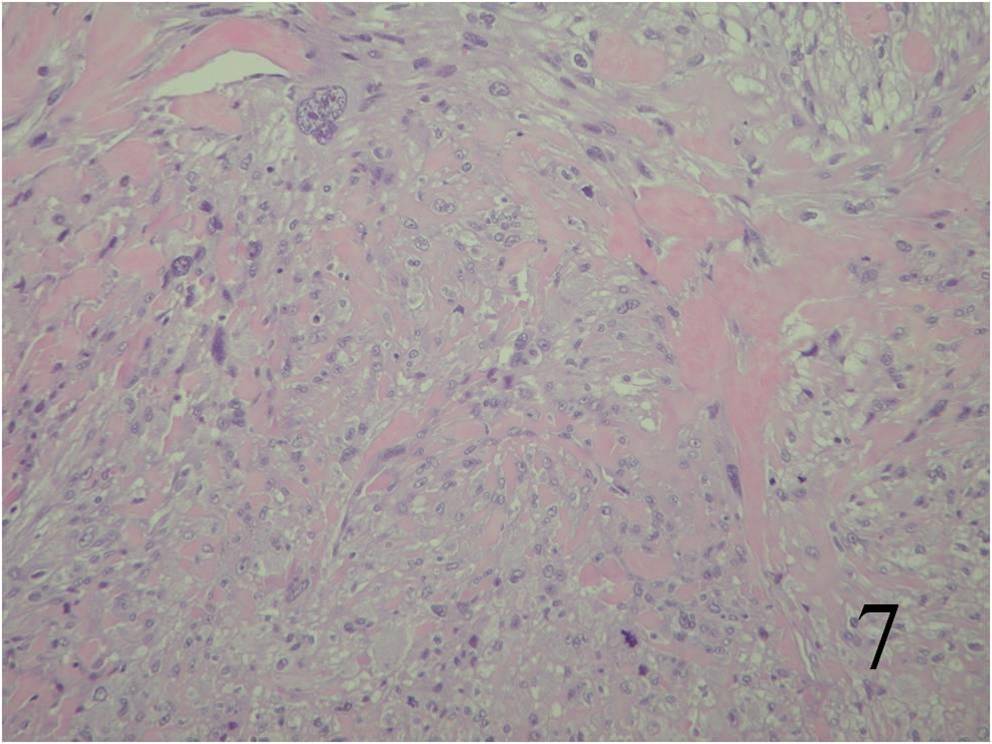 Fig. 7 Microscopic: Low and High (Fig. 8) power magnification of a leiomyosarcoma showing palisading spindle cells; with eosinophilic cytoplasm. Immunohistochemical stains for leiomyosarcoma are positive stain for actin (Fig. 9) and desmin (Fig. 10)