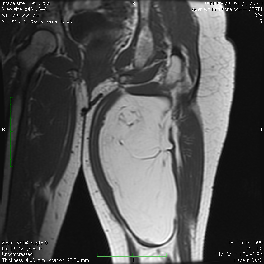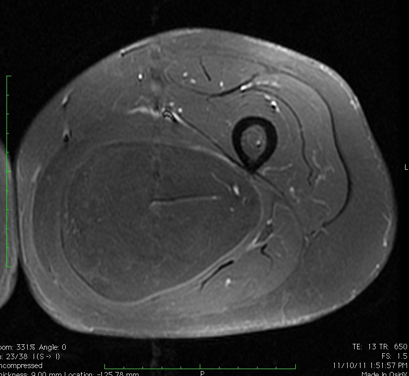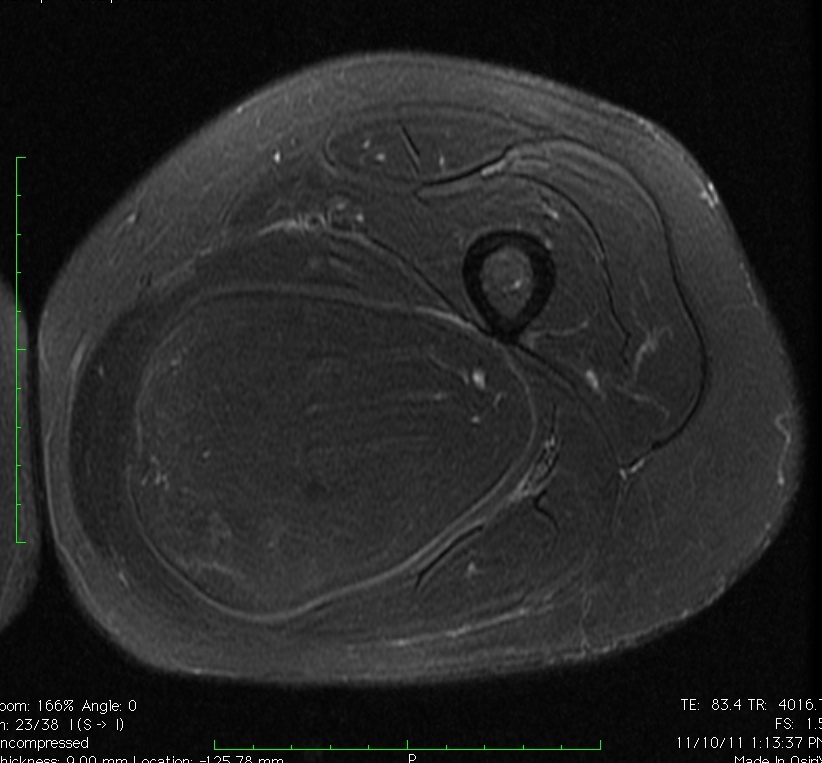 Fig. 1A, 1B, 1C, 2A, 2B, 2C: MRI of a lipoma: T1- weighted images shows an homogeneous mass in the posterior compartment of the thigh with high signal, saturates on fat saturated sequences with no or minimal enhancement. On T2-weighted images demonstrate an intermediate signal on FSE T2, saturates (becomes dark) on fat saturated sequences.