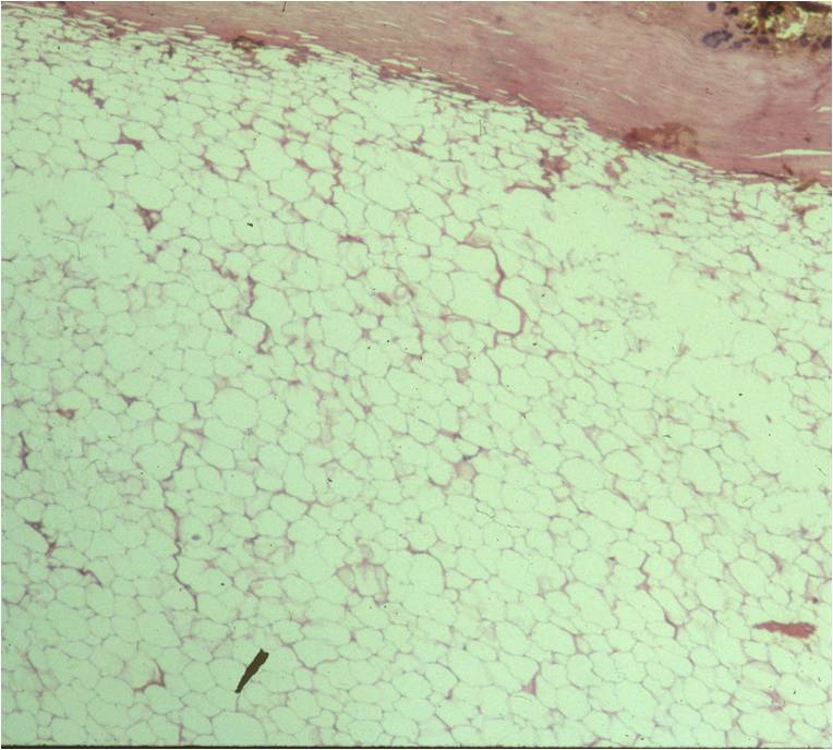 Fig. 4 & 5: Microscopic Pathology of a lipoma shows a homogeneous structure in low and high magnification with a uniform cell pattern and peripheral compressed nuclei barely discernible. Mature adipocytes. No mitoses.