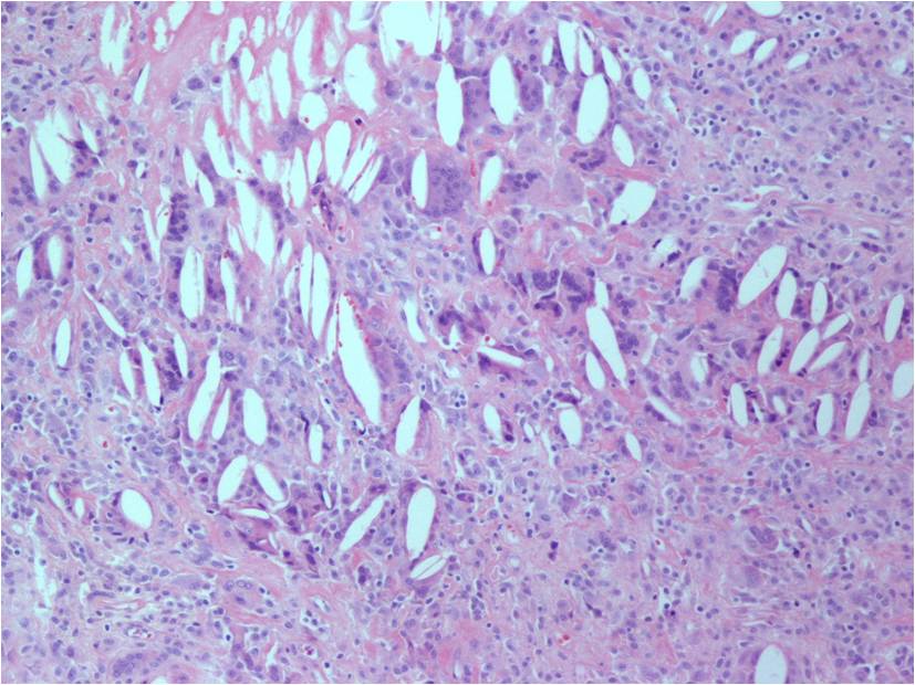 Fig. 12-14: Highly cellular sheet of spindled cells, multinucleated giant cells and chronic inflammatory cells with variable degree of pigmentation (hemosiderin). Numerous cleft-like spaces or ‘pseudoglandular’ spaces, surrounded by xanthoma cells. Cleft-like spaces are commonly seen in diffuse-type giant cell tumors.