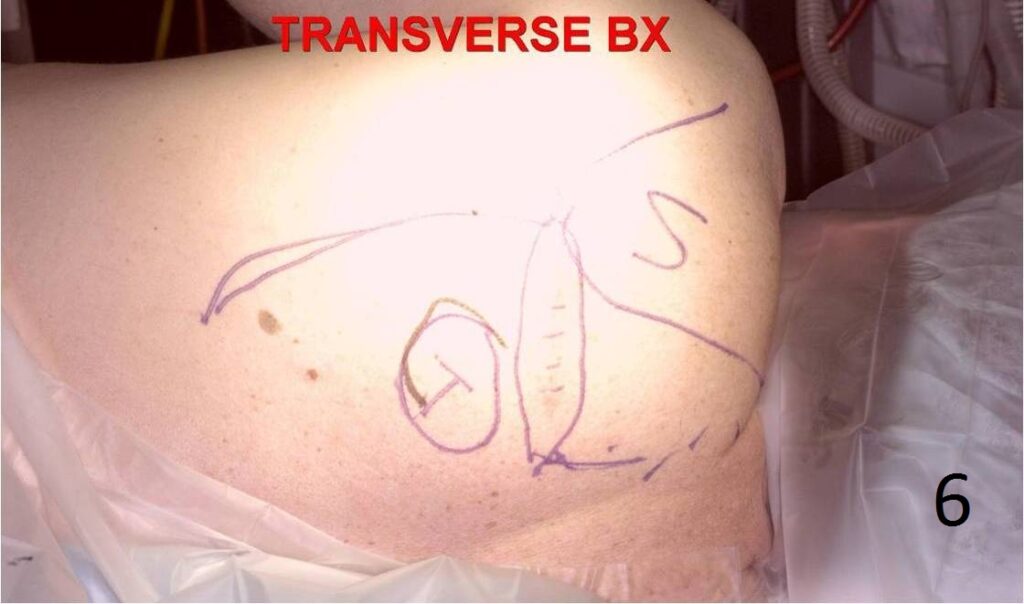 Fig. 6 Intraoperative photograph of skin incisions to remove a pleomorphic liposarcoma from the trapezius area. The patient had a previous biopsy through a transverse incision. Transverse incisions should rarely be used to biopsy a tumor.