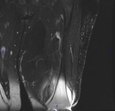 Fig. 2-4 MRI: Coronal T2-weighted fat suppressed (Fig. 2) and Axial T2-weighted FS (Fig. 3) shows low intensity signal isointense with fat. Adypocitic lesion with fatty signal is located in the posterior and medial compartment of the thigh. Thickened septa and nodularity enhances on post contrast images. (Fig. 4)