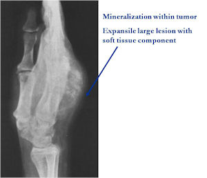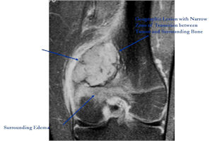 - There is often extensive edema around the tumor in the surrounding bone and soft tissues that can lead to a misdiagnosis of a malignant tumor.