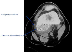 - There may be expansion of bone, cortical thinning and cortical breakthrough. A soft tissue mass may accompany this lesion but the soft tissue component is usually contained by the periosteum.