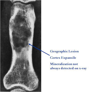 - Long Bones (30%; Most arise from diaphysis or metaphysis; Epiphyseal lesions are rare but may occur more often in the tubular bones of the hands or feet)