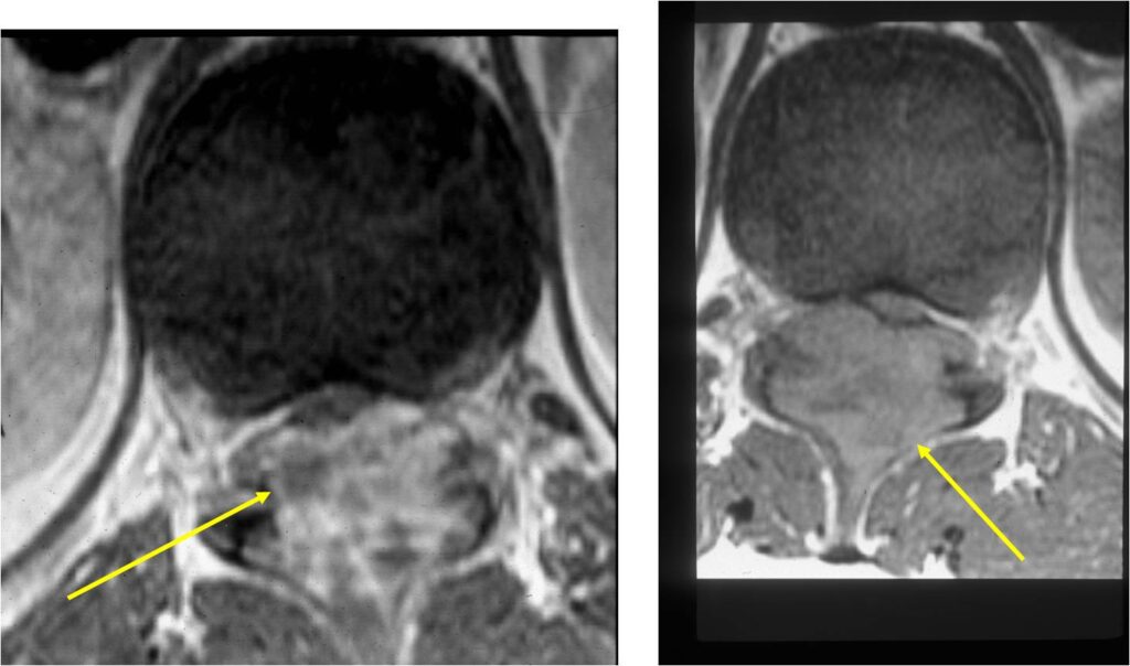 - Spinal lesions may be accompanied by muscle spasms, scoliosis and neurological manifestations