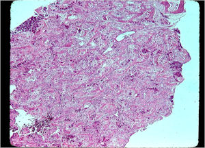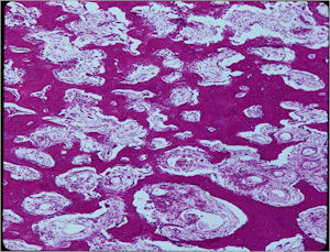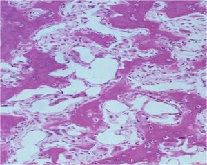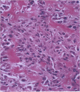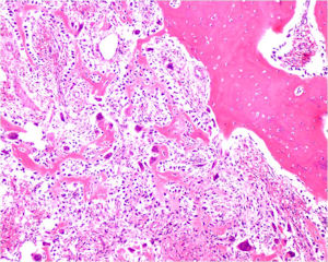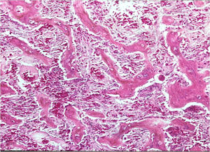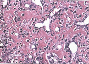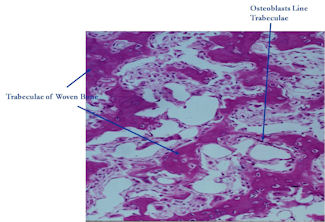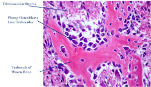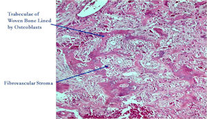 - Consists of well vascularized connective tissue stroma with interconnecting trabeculae of osteoid and woven bone