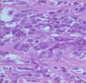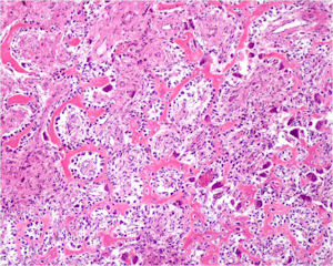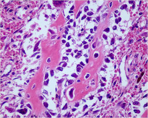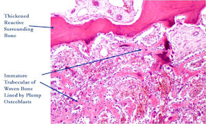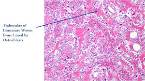 - They have a similar appearance microscopically as a conventional osteoblastoma except the osteoblasts are twice as large and have an epithelioid quality with abundant eosinophilic cytoplasm (Epithelioid Osteoblasts).