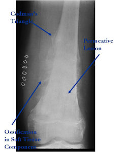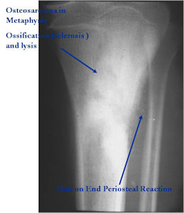 - The periosteum remains intact around the soft tissue component. Might need a CT scan to detect the subtle calcification (Egg Shell Rim of Calcification) associated with an intact periosteal reaction