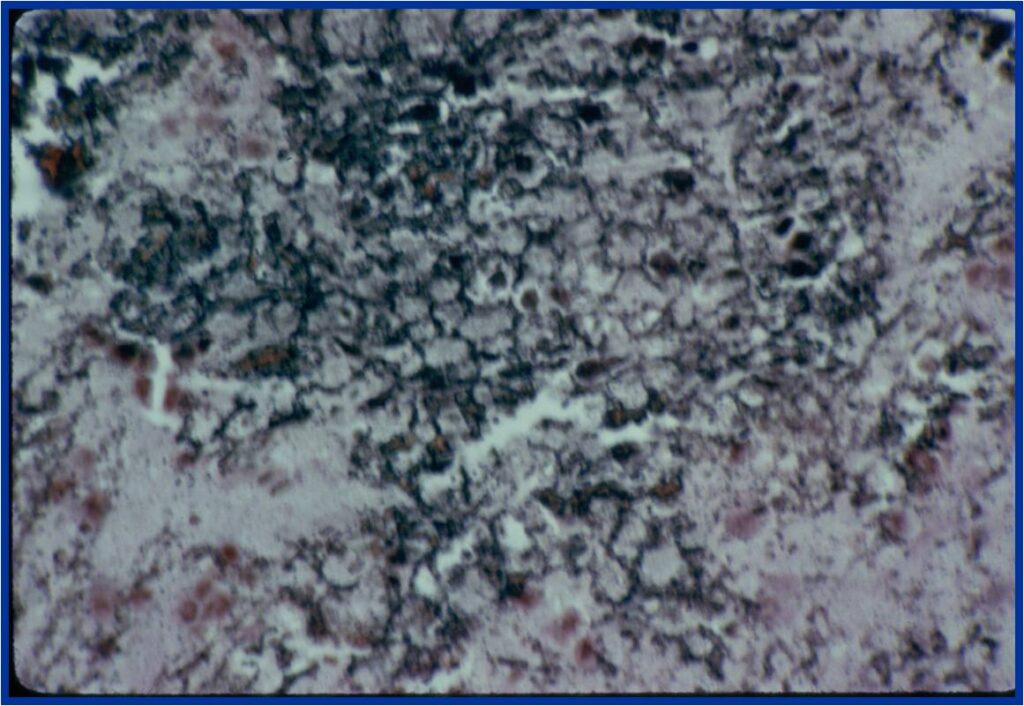 - Interspersed red areas from hemorrhagic necrosis