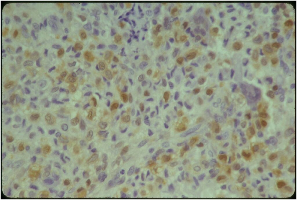 - High signal on T2 mixed with low signal areas (low signal areas proposed to be secondary to lysosomal content of highly cellular areas)