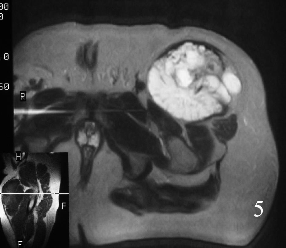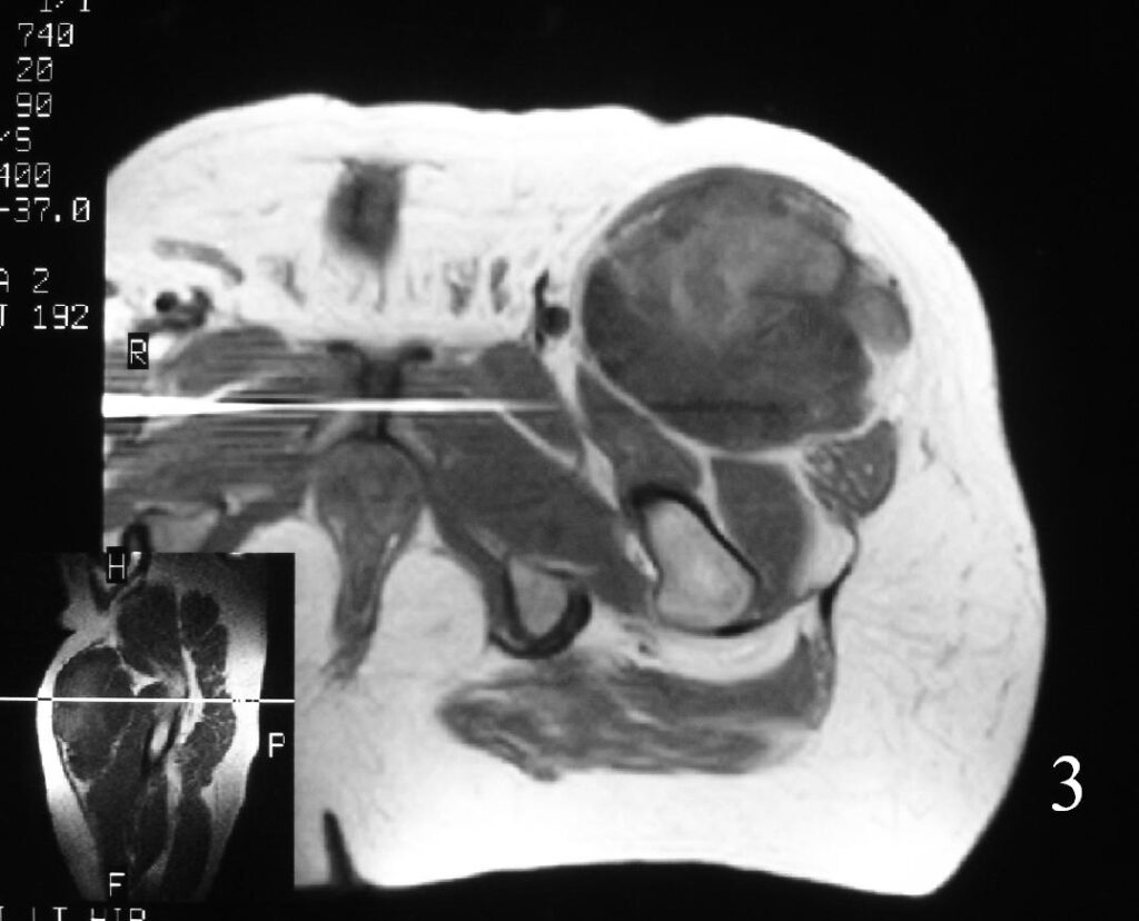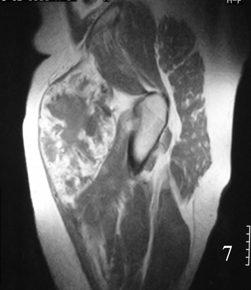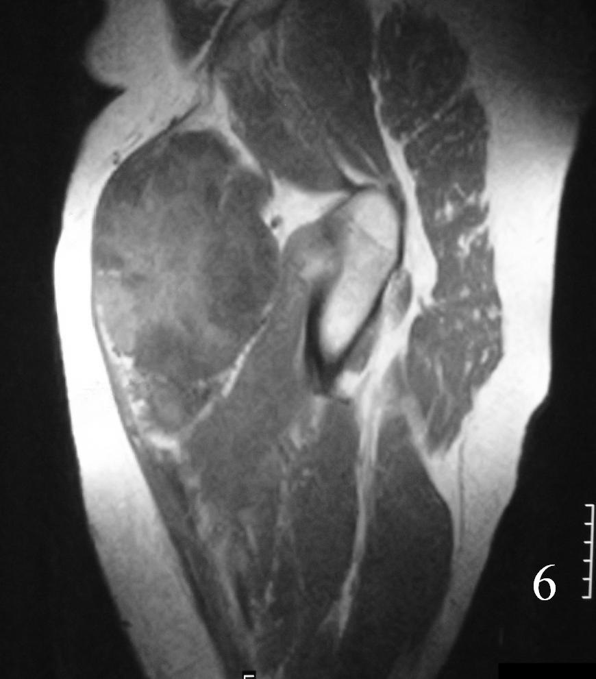 Fig. 3-7 Axial MRI of the lower extremity shows an extraskeletal soft tissue chondrosarcoma in different sequences with and without contrast (Fig. 3, 4, 5). Sagittal MRI (Fig. 6, 7) T1 with-without contrast demonstrates enhancement of the mass