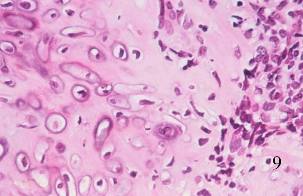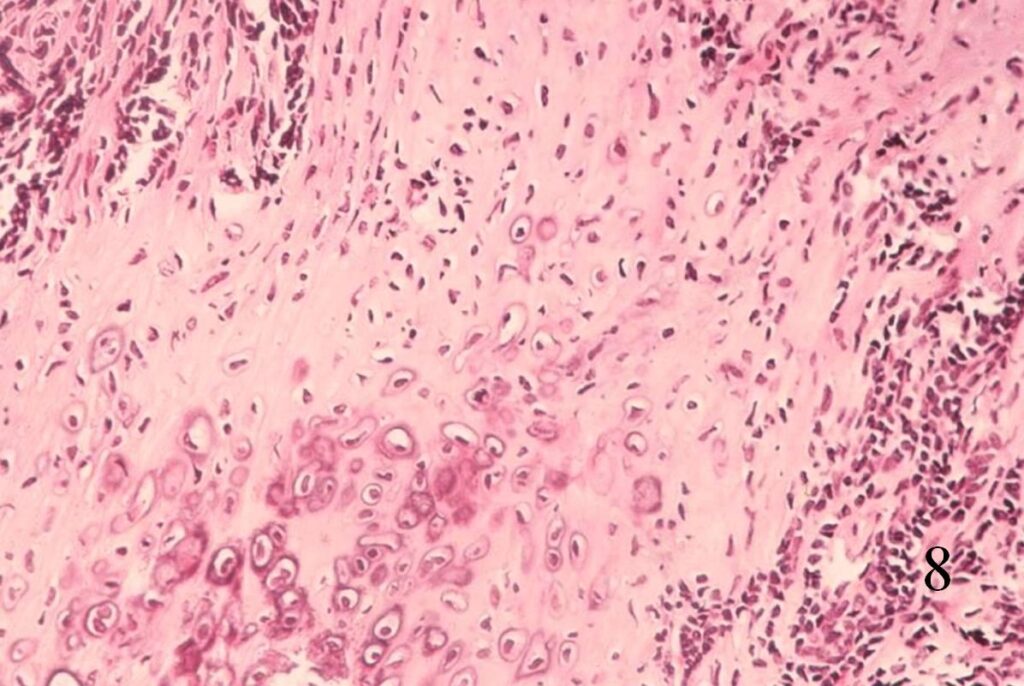 Fig. 8-10 Low (Fig. 8) and high power (Fig. 9) magnification of a mesenchymal chondrosarcoma shows cartilaginous areas and a mesenchymal component.