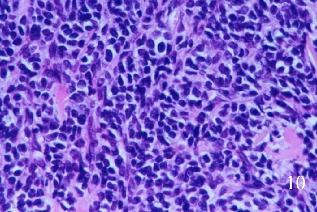 Fig. 10. High power magnification of mesenchymal area shows an area of undifferentiated small round blue cells.