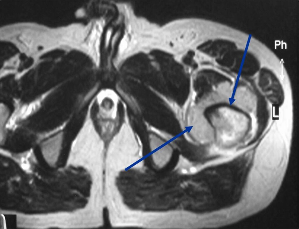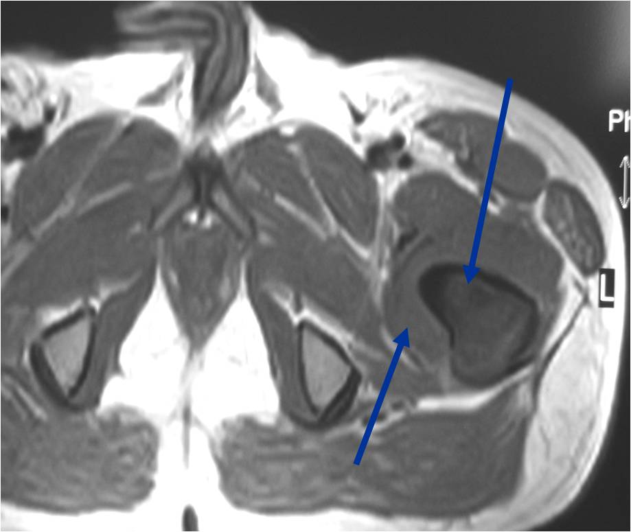 - Soft tissue mass— by CT (80%); by MRI (100%)