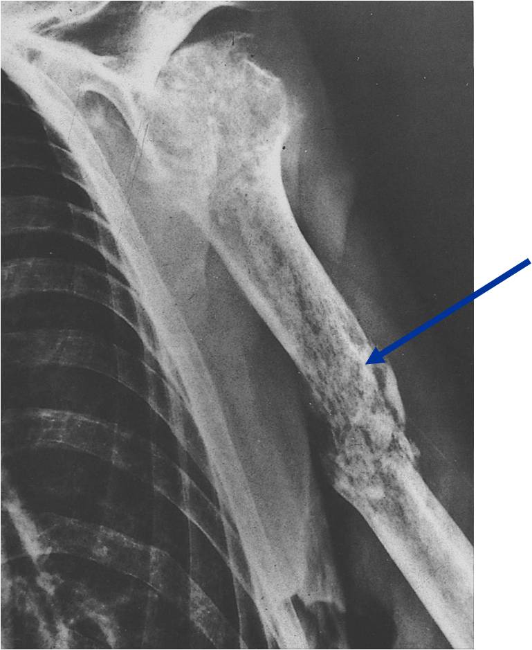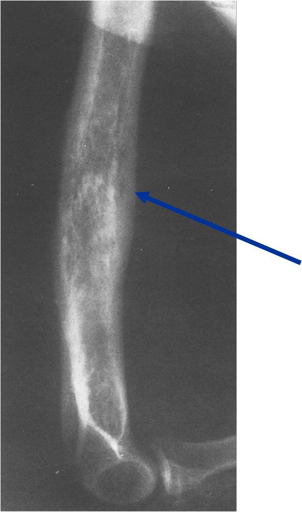 - Mixture of bone spicules and marrow fat as lesion permeates through the medullary canal and has an indistinct margin