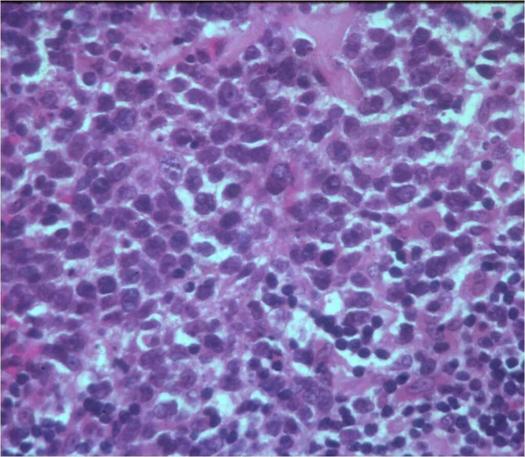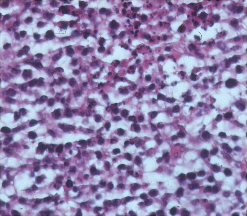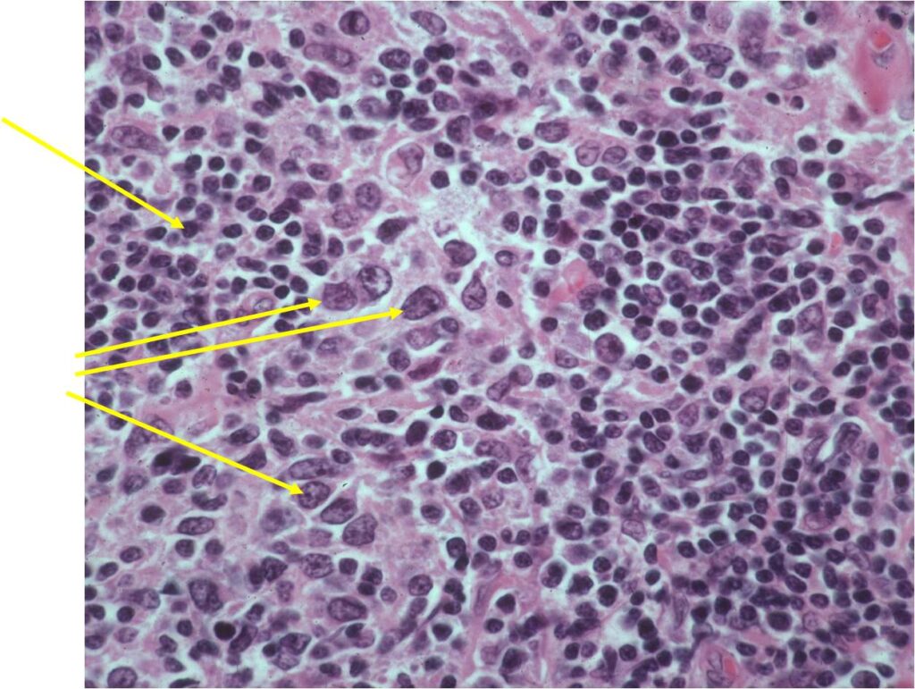 - Mixture of small lymphocytic cells and larger histiocytic components (Large Malignant B Cells in most cases)