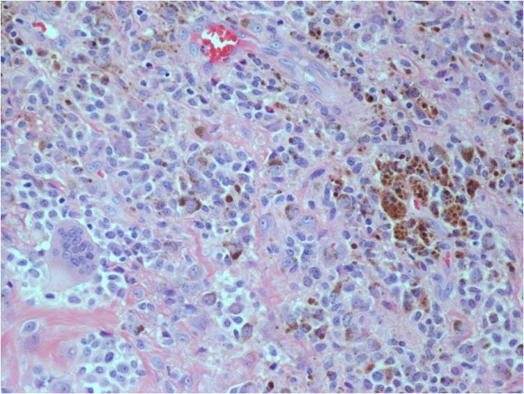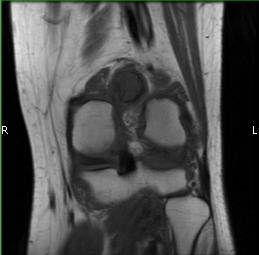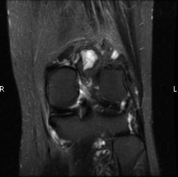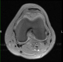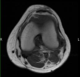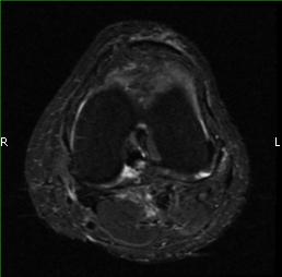 Pigmented villonodular synovitis (PVNS) is described as a benign villous or nodular proliferation of synovium. Pigmented villonodular synovitis occurs commonly in the third and fourth decades of life. Also known as diffuse tenosynovial giant cell tumor. It is characterized by the onset of monoarticular pain and swelling, the knee being the most frequently affected (80%). Tendon, bursa, or another joint can be infrequently involved. The synovial fluid is characteristically brown (old blood) or hemorrhagic, and the plain radiograph is usually normal but erosions into the bone and subchondral cyst can occur. PVNS is best diagnosed by synovial biopsy. Microscopic examination reveals a characteristic histology, including marked synovial cell hyperplasia and subsynovial invasion by masses of polygonal cells, multinucleated giant cells, and lipid-filled macrophages. Hemosiderin deposits are all around the tissue previously took for biopsy. The Hemosiderin have a characteristic appearance on magnetic resonance imaging scans, with nodular foci of decreased signal on both T1- and T2- weighted images. A synovectomy is recommended although recurrence is common.