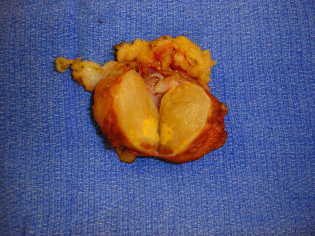 - Other possible appearance is Multinodular tumor with white, yellowish and brownish areas.
