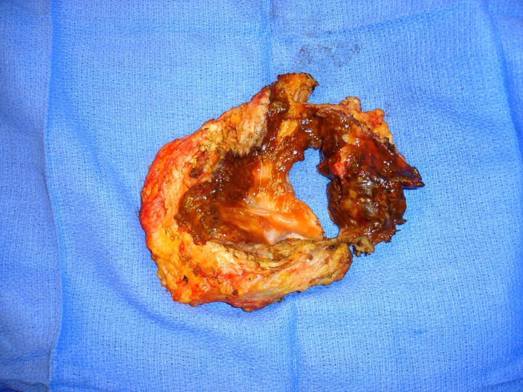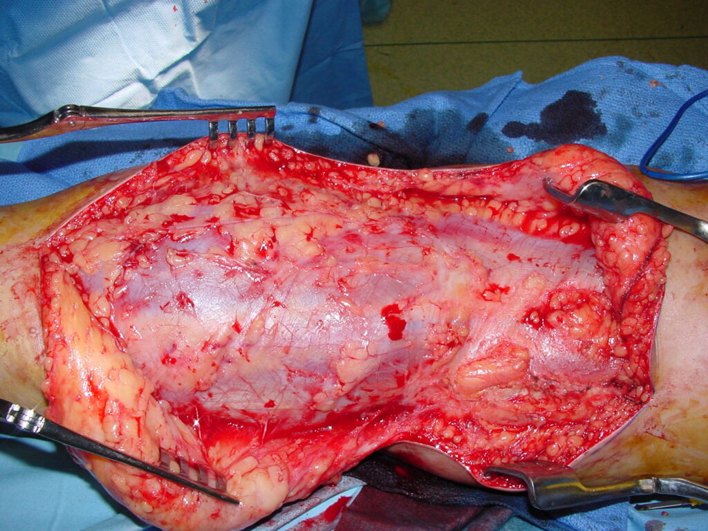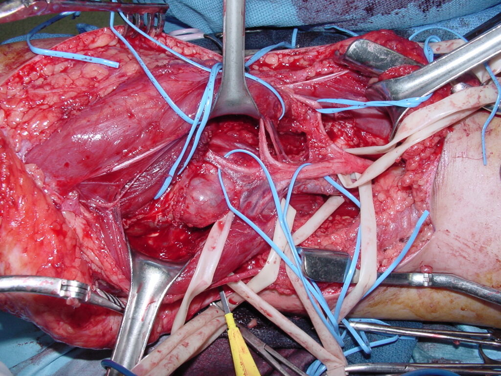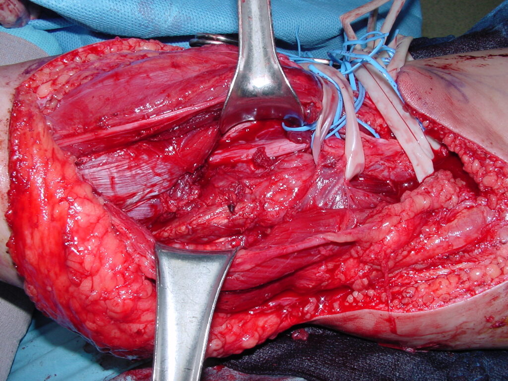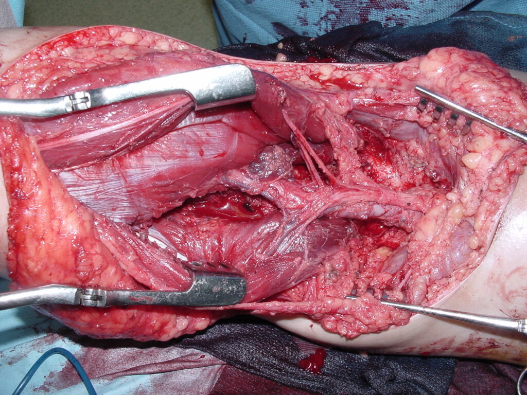 Fig. 15-18: Posterior approach of the knee, demonstrates the resection of PVNS from the popliteal area of the knee. Extensive dissection of the neurovascular structures was previously carried out. The PVNS was surrounding the blood vessels and nerves in the leg.