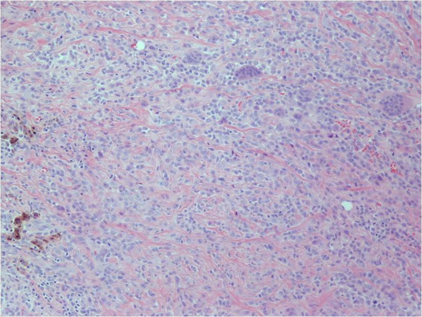 Fig. 12-14: Highly cellular sheet of spindled cells, multinucleated giant cells and chronic inflammatory cells with variable degree of pigmentation (hemosiderin). Numerous cleft-like spaces or ‘pseudoglandular’ spaces, surrounded by xanthoma cells. Cleft-like spaces are commonly seen in diffuse-type giant cell tumors.