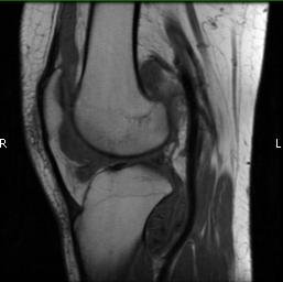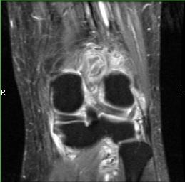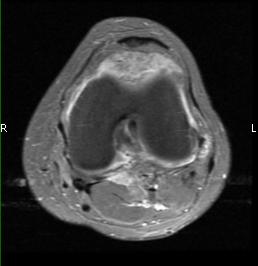 Fig. 1-10: Magnetic Resonance of a PVNS of the knee shows a synovial mass with minimal bone erosion of the medial articular plate. On T1W and T2W images shows a tumor with low intensity areas (hemosiderin) and hemorrhage. Joint effusion is well demonstrated. Post contrast images demonstrate an irregular pattern of enhancement.