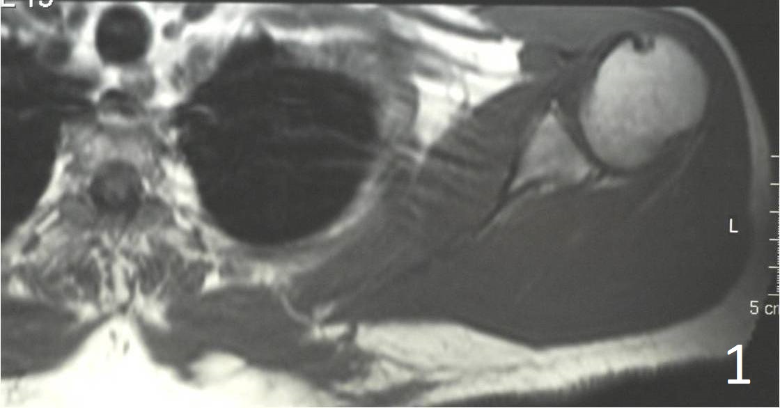 Fig. 1, 2 Axial MRI of shoulder shows a lesion in the subcutaneous tissue along the postermedial border of the scapula.