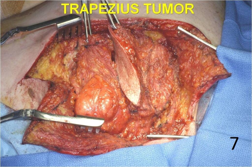 Fig. 6 Intraoperative photograph of skin incisions to remove a pleomorphic liposarcoma from the trapezius area. The patient had a previous biopsy through a transverse incision. Transverse incisions should rarely be used to biopsy a tumor.