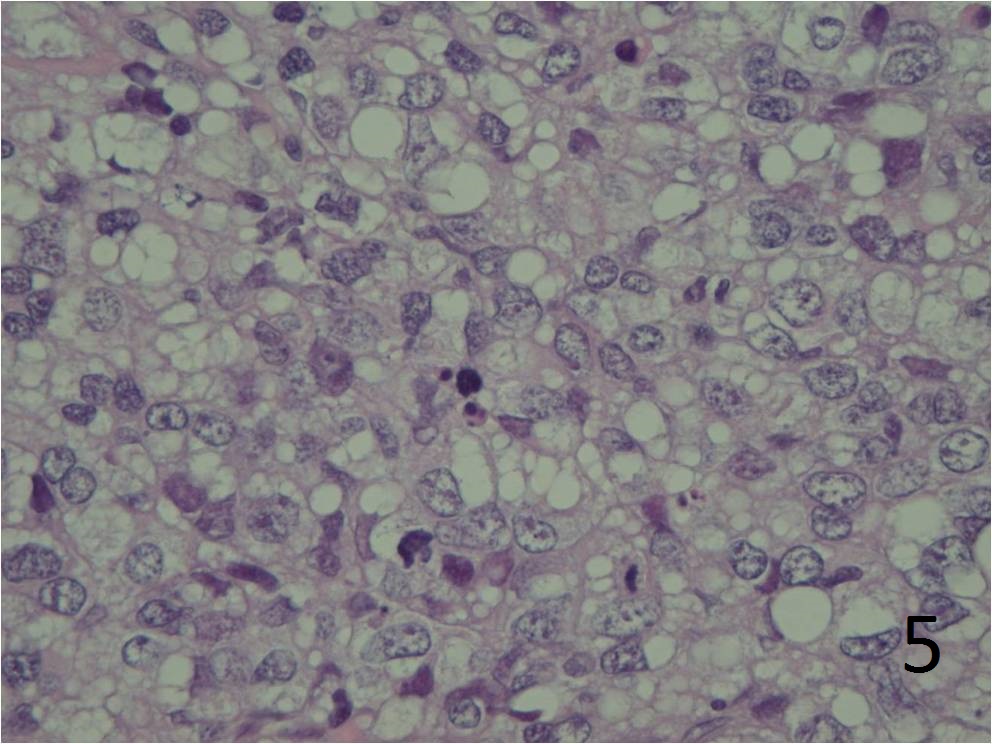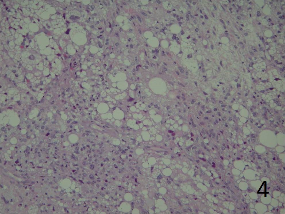 Fig. 4 Microscopic: Intermediate and high (Fig. 5) power magnification show prominent pleomorphism, and many lipid vacuoles; cells are large and multinucleated. The lipoblasts are pleomorphic.