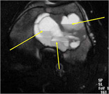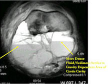 - They may appear as a large blood clot filling a single large cystic cavity; hemorrhagic and necrotic mass; or a multicystic fluid-filled lesion