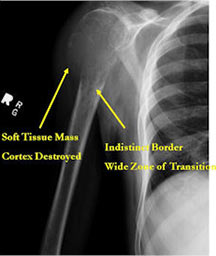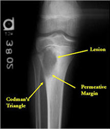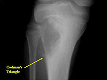 - May have Codman’s triangle and malignant appearing periosteal reaction in most cases