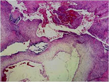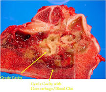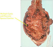 - It is a cancerous tumor largely composed of cystic cavities containing necrosis and hemorrhage