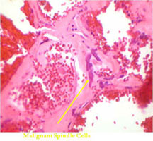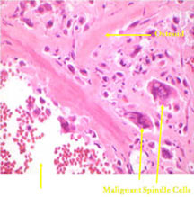 - Septa composed of atypical, bizarre, malignant appearing spindle cells with atypical nuclei and atypical mitotic figures