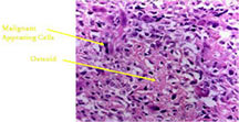 - Thin septae exist between the cystic cavities that harbor malignant appearing spindle cells producing scant osteoid