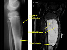 - The cystic spaces filled with hemorrhagic material leads to the presence of fluid-fluid levels on MRIs (so called ABC-like changes or telangiectatic change)