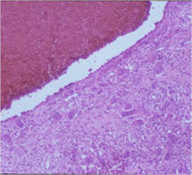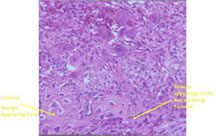 - In highly necrotic tumors that appear grossly as blood clot, malignant cells may be separated in a background of necrotic and bloody debris and may be difficult to identify.