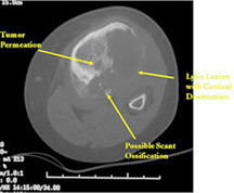 - Cortical destruction and soft tissue extension are common