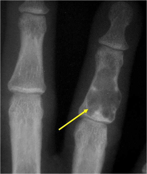 Geographic lesion, Stippled calcifications in lesion, Phalanx is expanded, Significant endosteal scalloping, No cortical destruction, No soft tissue extension, Cortex Scalloped and Expanded
